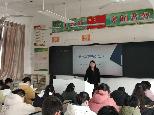 下午第二节课白甸初中朱映红老师执教汇报《一元一次不等式(组)》复习课、瓦甸初中马月彪老师执教汇报《二次根式》复习课。两位老师同时开课,分别对“双减”背景下的中考复习课堂进行了呈现。