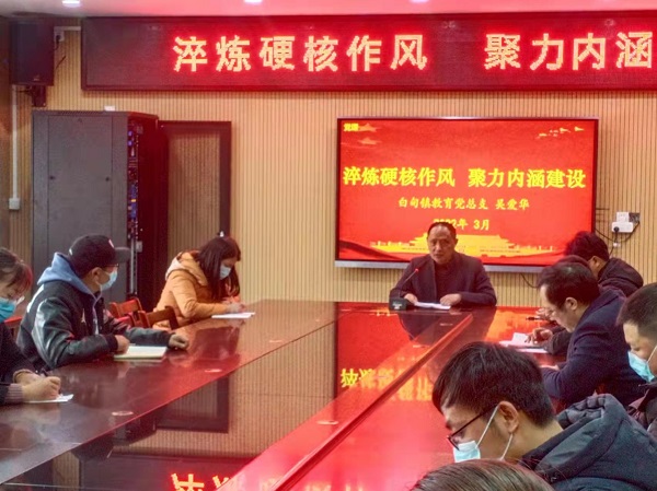 3月18日上午,白甸镇教育党总支吴爱华书记来到白甸初中党支部,为全校所有党员干部上了一节《淬炼迎合作风 聚力内涵建设》的党课。